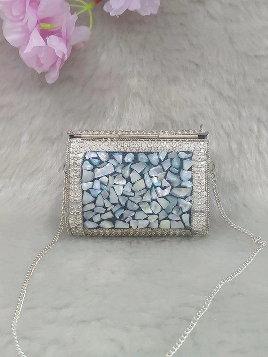 Silver Rectangular Mini Metal Clutch / Sling Bag / Handbag #C011 - Decorated with Shell