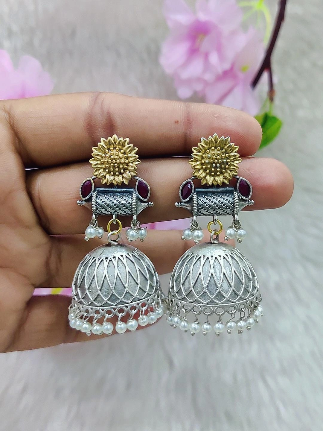 German Silver Jhumi Earrings #GE110 - Red