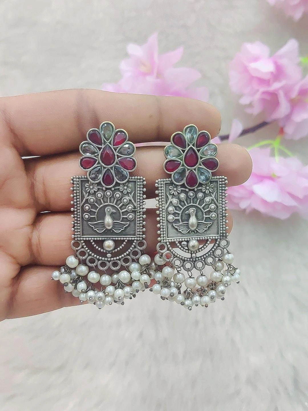 German Silver Flora Earrings #GE027 (Red + White Monalisa Stone)