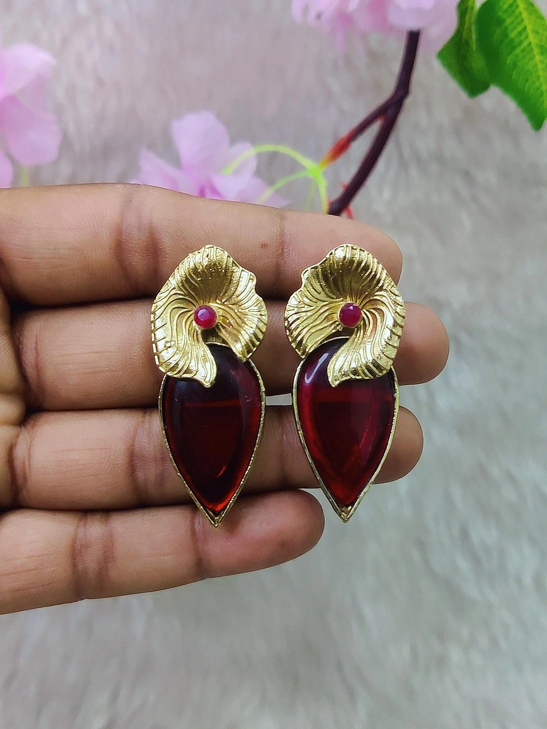 German Silver Floral Earrings #GE100 - Red Monalisa Stone