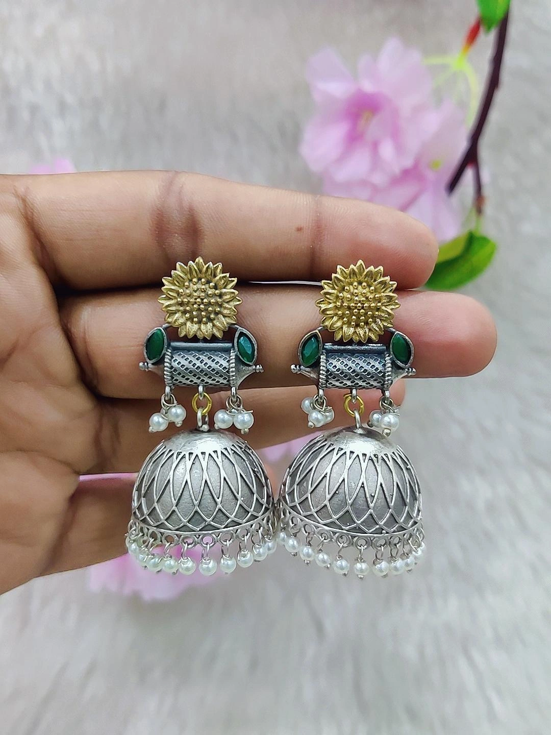 German Silver Jhumi Earrings #GE110 - Green