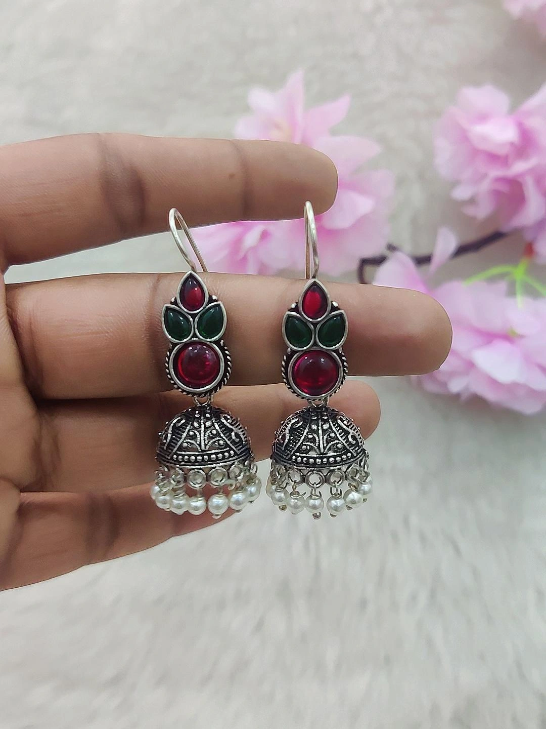 German Silver Jhumki Earrings #GE016 (Red+Green)