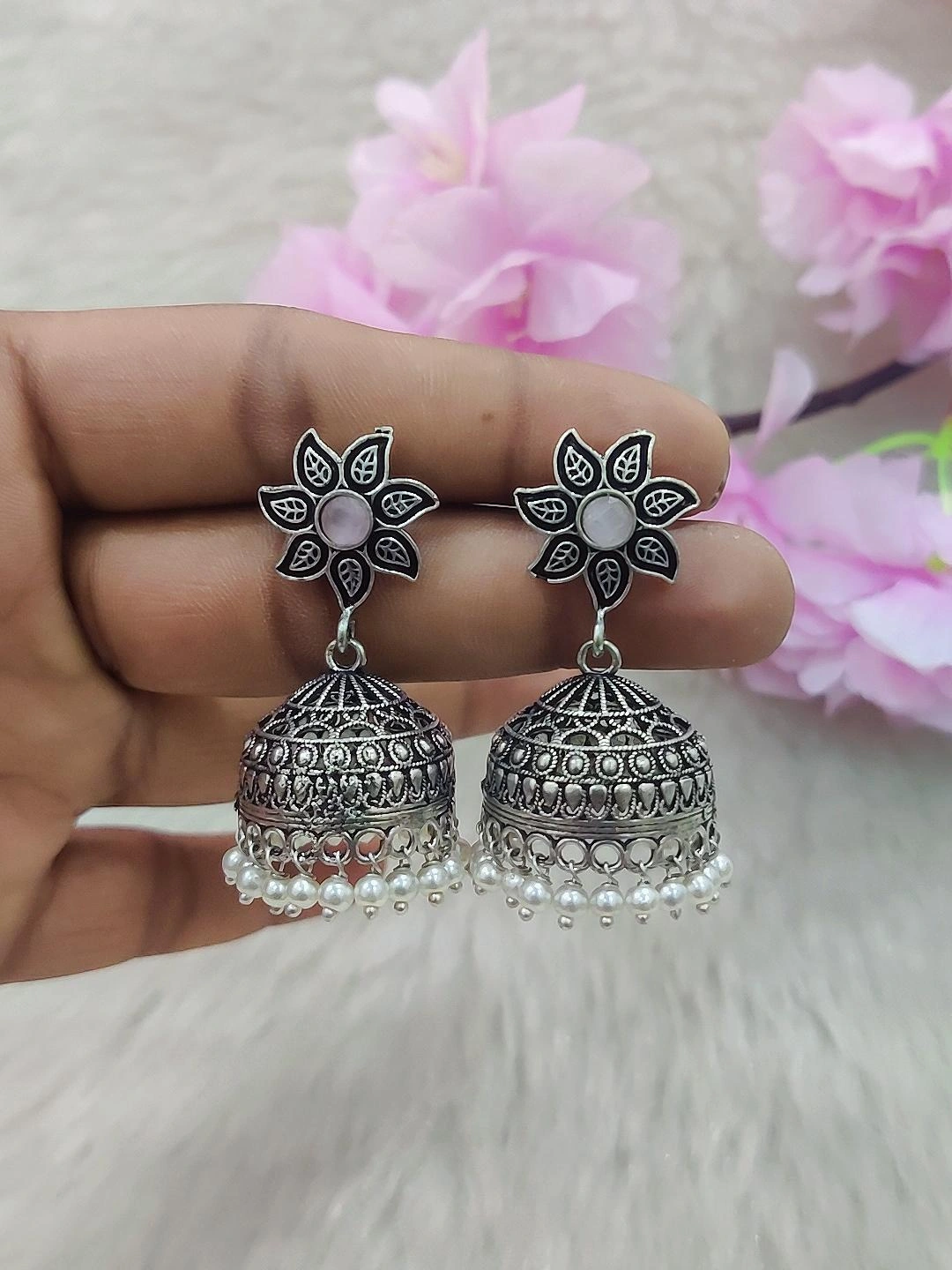 German Silver Jhumki Earrings #GE018 (Pink)