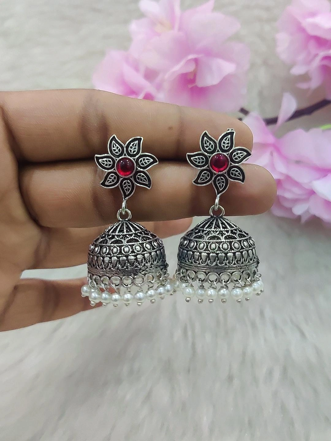 German Silver Jhumki Earrings #GE018 (Red)