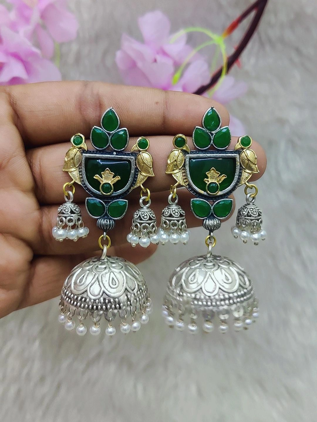 German Silver Jhumki Earrings #GE101 - Green