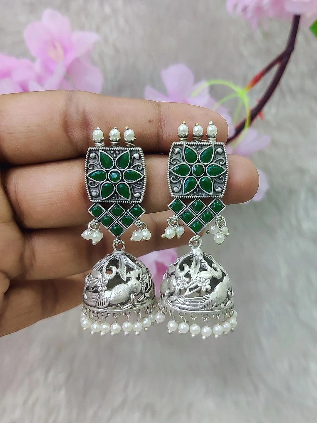 German Silver Jhumki Earrings #GE102 - Green